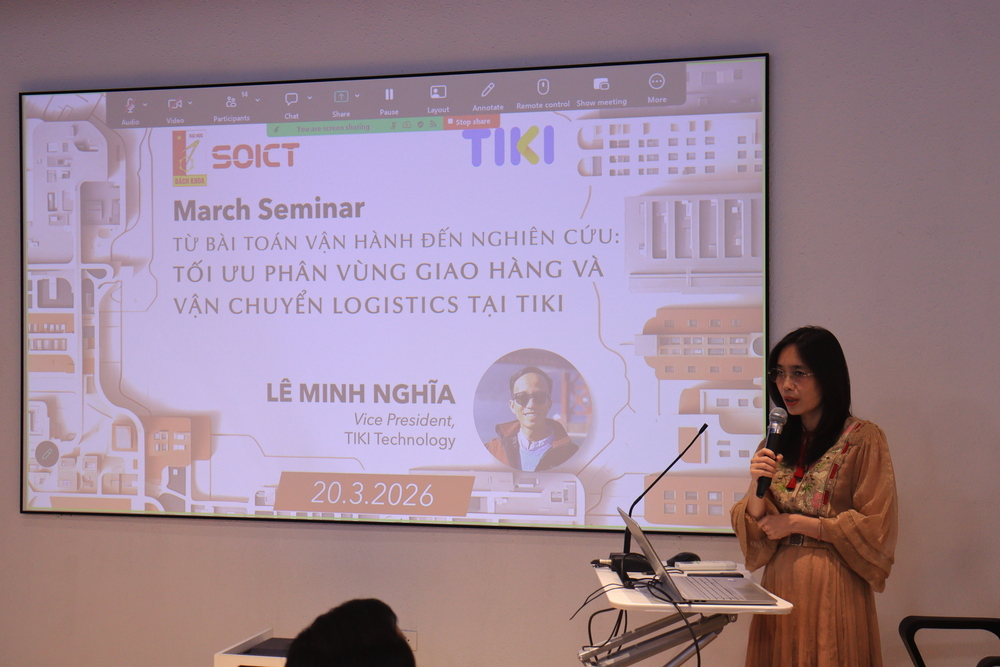 Ngày 20 tháng 3 năm 2026, Trường Công nghệ Thông tin và Truyền thông đã tổ chức Seminar định kỳ tháng 03 với sự tham gia trình bày của ông Lê Minh Nghĩa (Tiki). Chương trình thu hút đông đảo giảng viên, nghiên cứu sinh và sinh viên quan tâm đến các bài toán tối ưu hóa trong vận hành hệ thống thương mại điện tử quy mô lớn.
