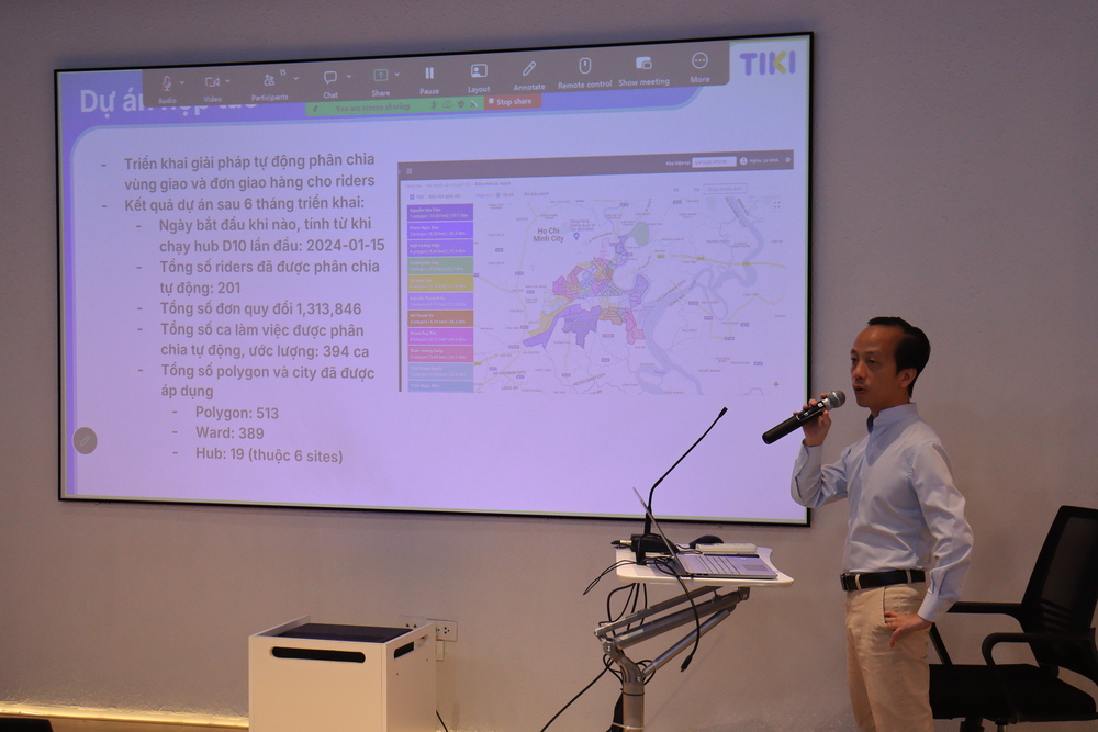 Tại seminar, ông Lê Minh Nghĩa đã mang đến bài trình bày với chủ đề về tối ưu logistics trong thương mại điện tử, tập trung vào các bài toán thực tiễn như phân chia khu vực giao hàng cho shipper và tối ưu vận chuyển chặng giữa (line-haul). Diễn giả phân tích cách áp dụng các phương pháp tối ưu và thuật toán để nâng cao hiệu quả vận hành, giảm chi phí và cải thiện tốc độ giao hàng trong hệ thống logistics phức tạp. Những chia sẻ này phản ánh rõ cách các doanh nghiệp công nghệ giải quyết bài toán quy mô lớn trong môi trường dữ liệu liên tục biến động.